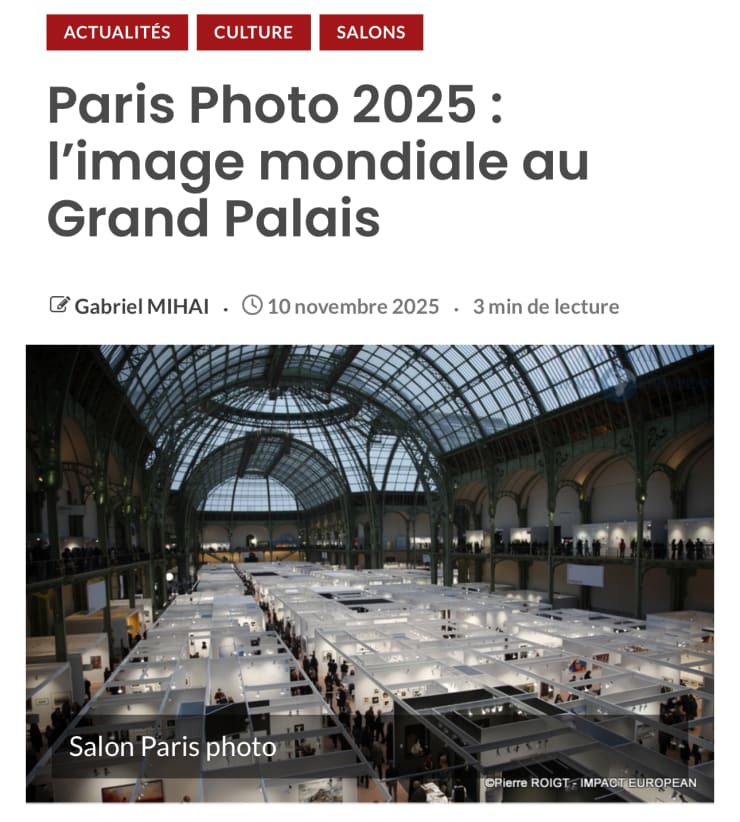 Paris Photo 2025 ouvre ses portes au Grand Palais du 13 au 16 novembre. 224 exposants venus de 33 pays célèbrent la diversité et la modernité de la photographie mondiale.Gabriel Mihai, Journal Impact Européen, November 10, 2025 -