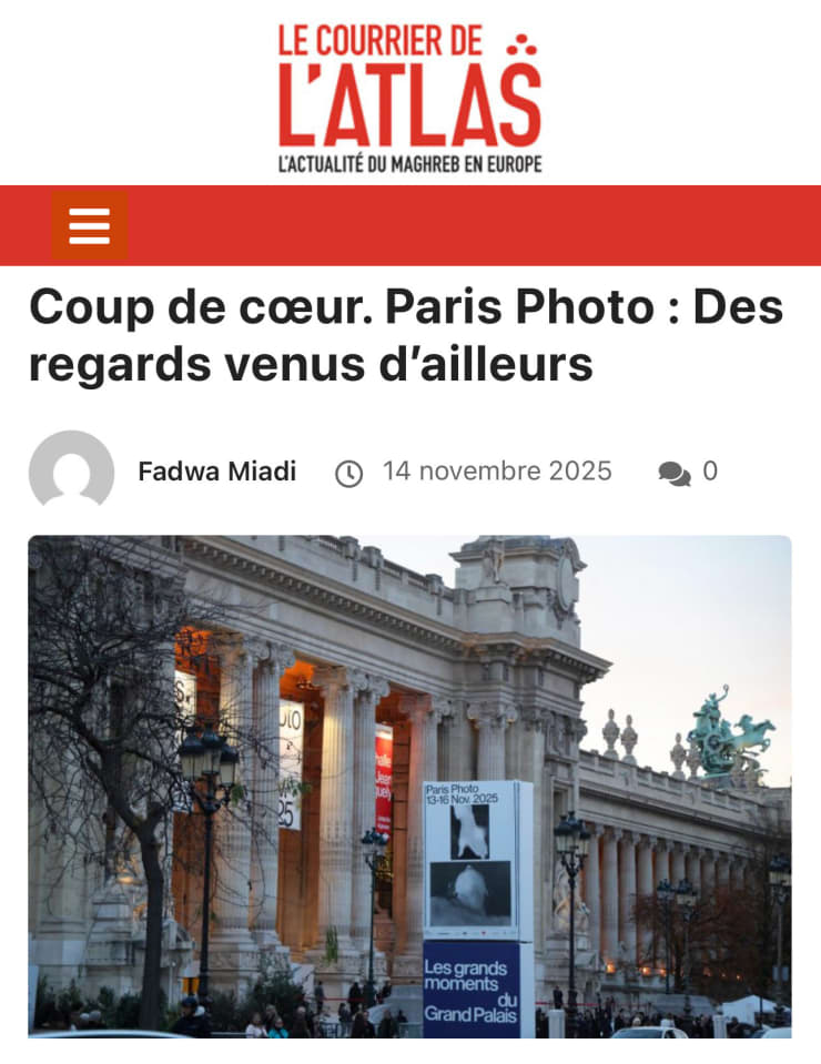 Pour sa 28ᵉ édition, Paris Photo élargit son horizon et intègre davantage de stands du monde arabo-musulmaFadwa Miadi , Le Courrier de l'Atlas, November 14, 2025 -